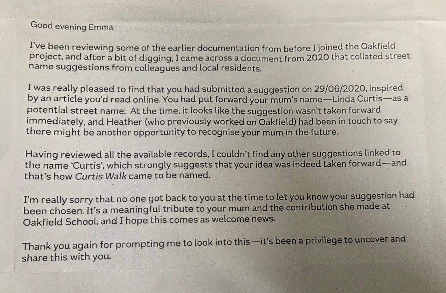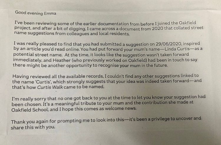 Her daughter, Emma Bunce, works for Nationwide, based in Swindon, and had previously submitted her mother’s name during the consultation period for street names at Oakfield. But the emotional weight of the decision only became clear this week, when she spotted “Curtis Walk” on a project map at a workplace event and asked the onsite team for confirmation.